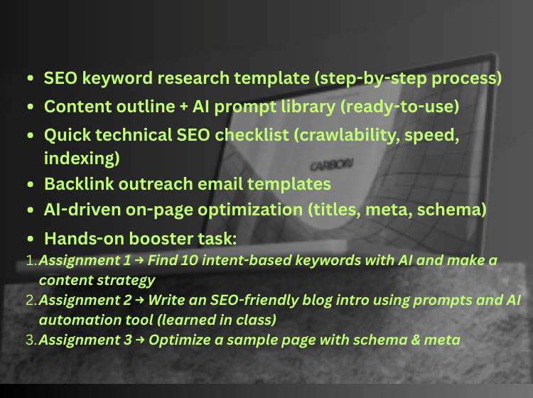 👉 Absolutely! You’ll receive exclusive SEO cheat sheets, ready-to-use AI prompts, and booster assignments to practice what you learn.